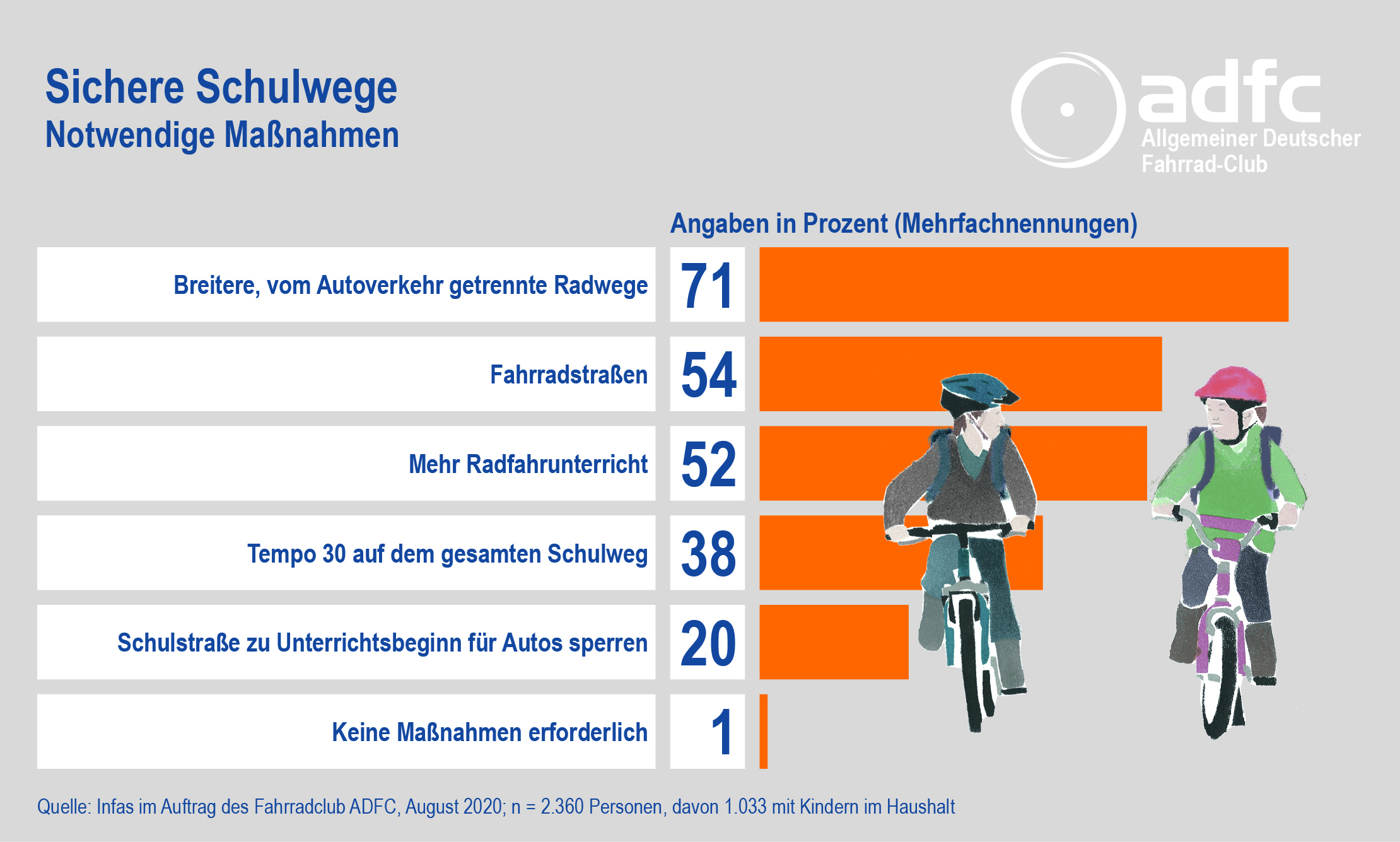 Eine überwältigende Mehrheit der Bevölkerung (99 Prozent) findet, dass Maßnahmen erforderlich sind, damit mehr Kinder mit dem Rad zur Schule fahren. Breitere und vom Autoverkehr getrennte Radwege (71 Prozent) sowie die Einrichtung von Fahrradstraßen (54 Prozent) sind dabei die wichtigsten Forderungen. Ein Drittel der Bundesbürgerinnen und Bundesbürger hält es generell für unsicher, wenn Kinder mit dem Fahrrad zur Schule fahren. Das zeigt eine aktuelle Infas-Umfrage im Auftrag des ADFC. Der Fahrradclub fordert den beschleunigten Ausbau der Schulradwegenetze.