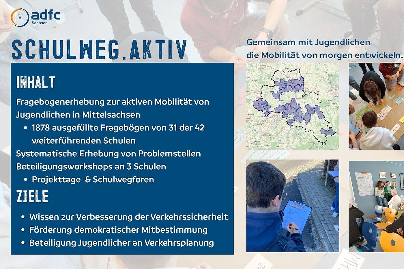Der ADFC Sachsen rückte in dem Projekt die Perspektive der Jugendlichen gezielt in den Fokus und erprobte, wie diese in zukünftige Verkehrsplanungen integriert werden kann. Welche Verkehrsmittel nutzen Jugendliche für welche Wege? Welche Rolle spielt das Radfahren für die Jugendlichen im Alltag? Was motiviert sie zum Fahrrad fahren und was hält sie davon ab? Welche konkreten Situationen im Verkehr empfinden sie als gefährlich? Welche Veränderungen in ihrer Gemeinde für die Mobilität wünschen sie sich? Diesen Fragen wird im Projekt Schulweg.Aktiv auf den Grund gegangen. Ziel dabei ist es auch, den Jugendlichen ihre Möglichkeiten zur aktiven demokratischen Beteiligung näher zu bringen.